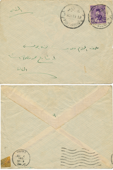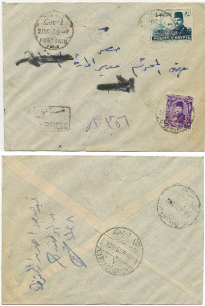 3 Aug 1949 cover franked 10m King Farouk Marechale from Port Fouad (بورفؤاد) to Cairo. Arrival next day.
