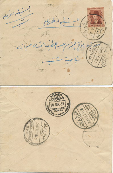 14 Mar 1939 cover franked 5m Farouk Boy King from Ismailia to a very small village called Sineta in Dakahlia Province. Tanta-Dumiat TPO, Mansura Mit-Ghamer TPO, Rural service TPO (Sineta- Kafr Awad) and Sineta CDSs on reverse. All on the same day.