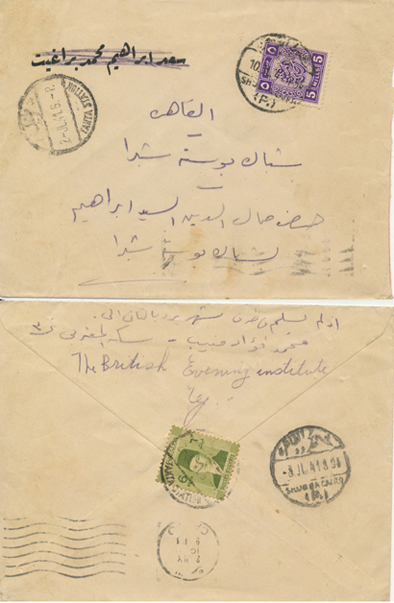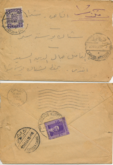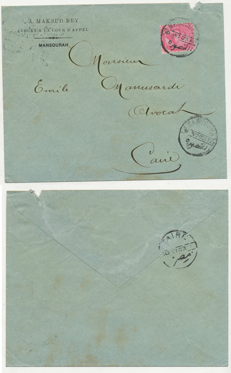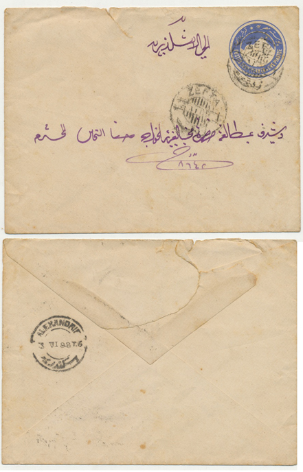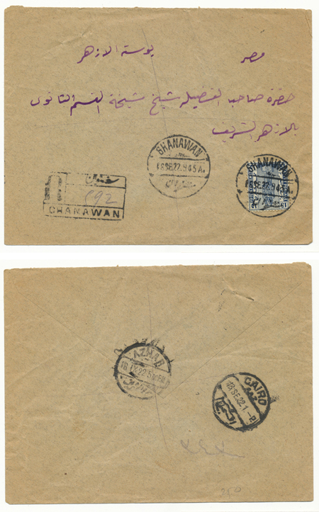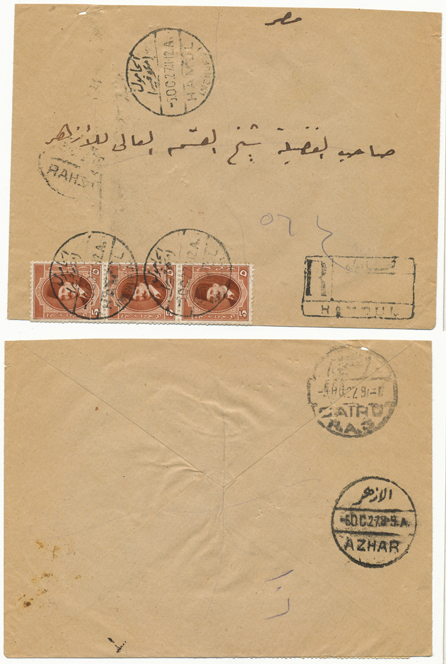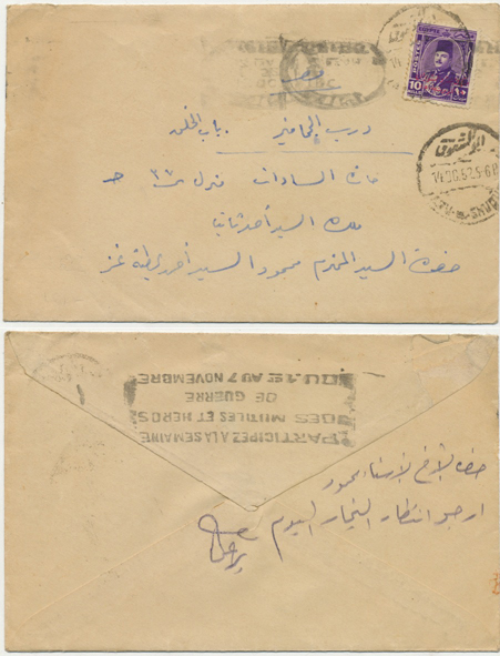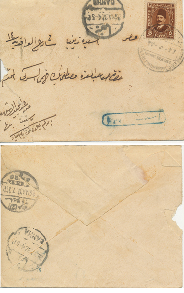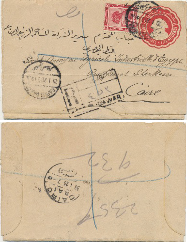 2 Nov 1917 cover franked 5m De La Rue Sphinx first pictorial issue from Qurashiya (القرشية، الزقازيق) to Cairo. Arrival next day. |