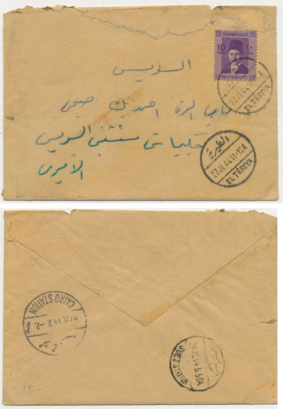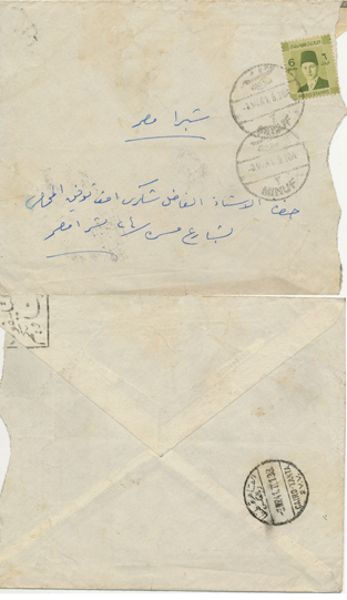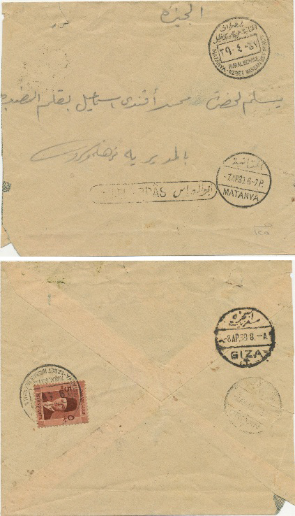 3 June 1942 cover franked 6m Farouk Boy King from Bahnai بهناي to Cairo through Kafr El Ghoneima |