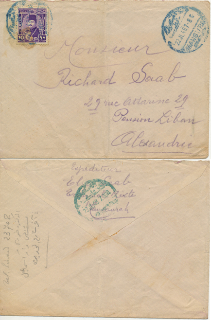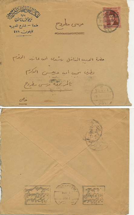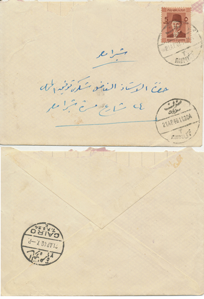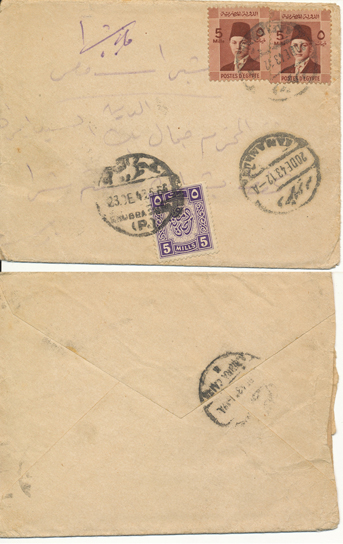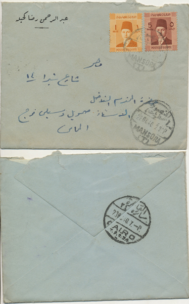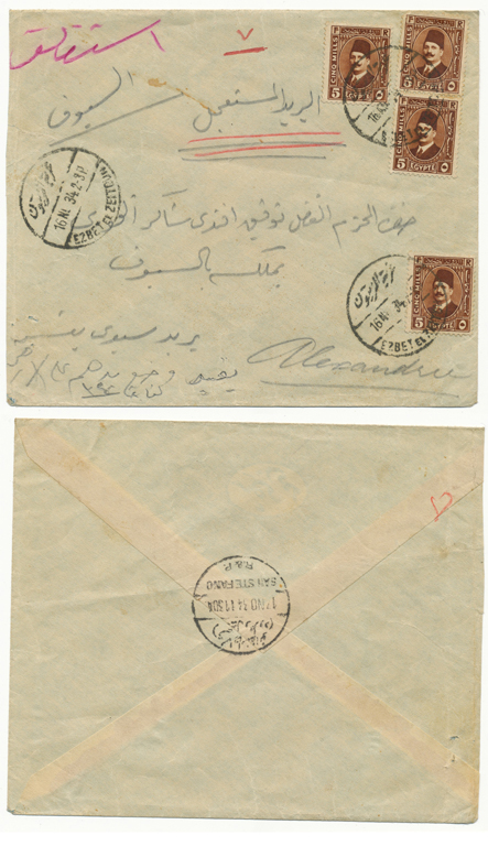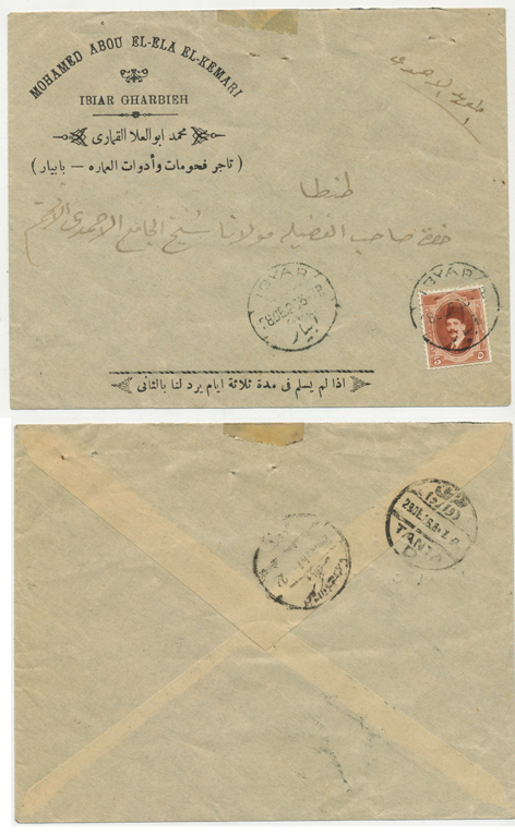 | 1EB | 28 Dec 1926 cover franked 5m King Fouad first portrait issue from Ibyar (ابيار) through Kafr El Zayat-Birma TPO to Tanta. Rare Ibyar CDS. |