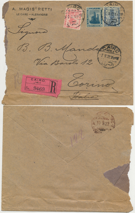 | 4I | 2 May 1922 registered cover franked 5m and 10m and 15m pictorial issue (Harrison) from Cairo, Egypt to Torino, Italy. Arrival mark. | ||