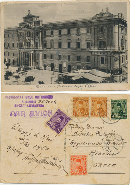 | 1GRE | 10 Jan 1950 postcard franked 2x1m+1x2m+1x4m+1x10m (total 18ms) King Farouk Marchal issue stamps from Alexandria by Airmail (Par Avion) to Athens, Greece. | ||