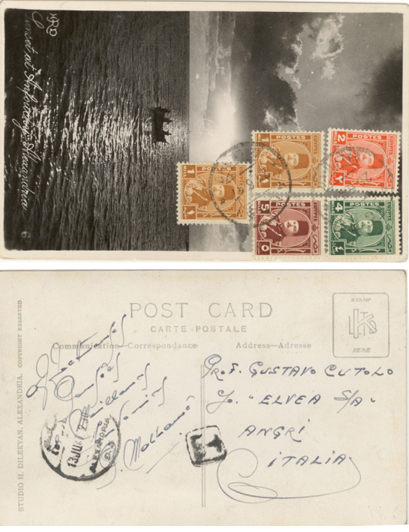 | 8I | 13 June 1947 postcard franked 2x1m, 2m, 4m, and 5m King Farouk stamps from Alexandria, Egypt to Angri, Italy. Postcard cancel on back with Alexandria 13 June CDS and also Postage Due Mark T. When the postcard arrived in Italy and they found that the Egyptian stamps were not cancelled at Alexandria, the postal authorities in Italy cancelled them with Angri, Salerno dated 20 Jun. | ||