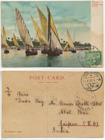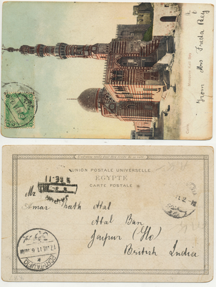 | 2IN | 14 Oct 1911 postcard franked single 2m De La Rue datestamped San Stefano, Alexandria to Jaipur, British India. Alexandria and Port-Taufiq (star above date band) CDSs are seen. No arrival mark. | ||