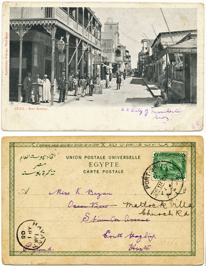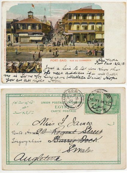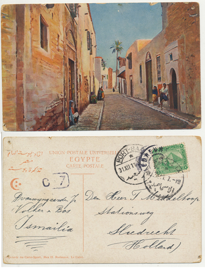| 1H | 31 Dec 1911 postcard franked 2m De La Rue stamp from Ismailia to Holland. Passed through Port Said (star above date band CDS). Mark (C7). | ||