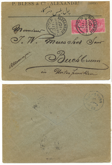 | 1G | 2 Jul 1900 cover franked 2x2m horizontal De La Rue (New Currency) from Alexandrie Egypt UNRECORDED datestamp (Smith Type IX Depart), to Germany, Buchbrunn (CDS on reverse). | 180 | |
