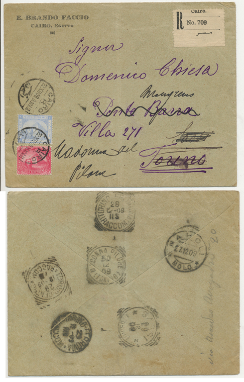 | 2I | 22 Dec 1909 registered cover franked 1p blue De La Rue (second period) and 5m De La Rue (Third period) from Cairo (Registeration) to Torino, Italy. Readdressed to Pilone, Italy. Cover shows postmarks of Napoli (Molo), two postmarks of Torrino Ferrovia, one postmark of Torino Centro, one postmark of Sassi and finally postmark of Pilone, Italy. | ||