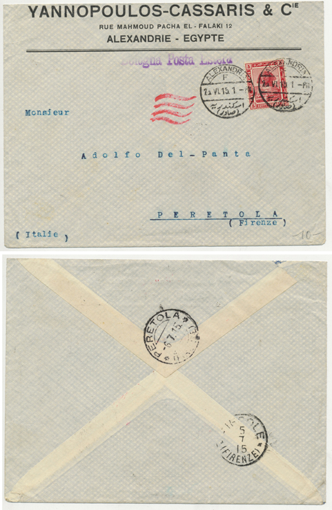 | 3I | 23 June 1915 cover franked 5m De La Rue first pictorial issue from Alexandria (F) to Egypt.Peretola, Firenze, Italy. Mark in red of foreign post censorchip in Bologna (Bologna Posta Estera) is seen. CDs of Firenze (Florence) and Peretola, Firenze, Italy. | ||