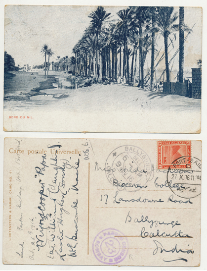 | 3IN | 27 Oct 1916 post card franked 4m De La Rue (first pictorial issue) from Portsaid to Ballygunge, Calcutta, India. Postcard shows Bombay Censor mark. Arrival Ballygunge Calcutta CBS. |
