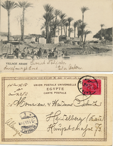 | 3G | 29 Dec 1904 postcard franked 5m De La Rue (New Currency) from Caire Egypt (Smith Type VIII) to Heidelberg, Germany. Heidelberg CDS. | ||