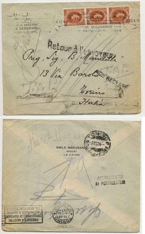 | 9I | 30 Oct 1924 cover franked a vertical strip of 3x5m King Fouad stamps from Cairo to Torino, Italy. Back shows Torino Centro and Torino, Distribution datestamps. Back also shows Sconosciuto Al Portalettre (address unknown to postman) mark and a rectangular mark asking in general to put the postal code. Front shows two marks (Retour a l'envoyeur) and (Non Reclamé). |