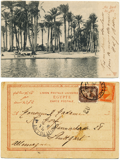 | 2G | 6 Nov 1903 postcard franked 1m and 3m De La Rue (New Currency) from Alexandrie Egypt (Smith Type VIII) to Stuttgart, Germany. Stuttgart CDS. | ||