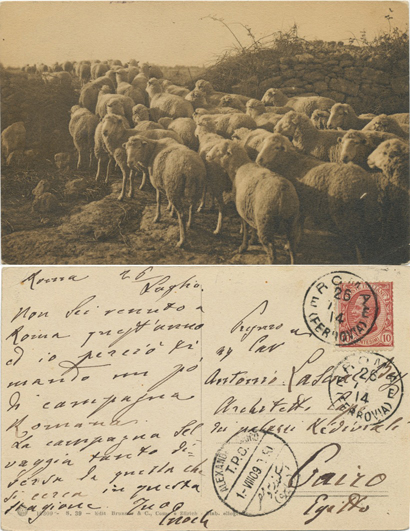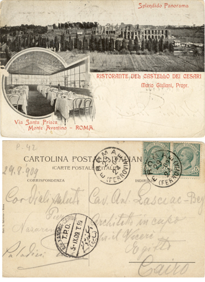 1 Aug 1909 postcard franked 10c stamp from Roma (Ferrovia). Extra cancel. Postcard addressed to Cairo. Alexandria-Cairo TPO CDS.