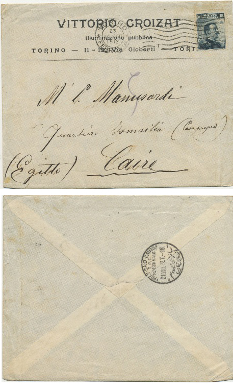 16 Aug 1912 cover franked 15c stamp machine cancelled from Torino Ferrovia to Cairo. Back shows Portsaid-Cairo TPO Foreign Mails CDS.