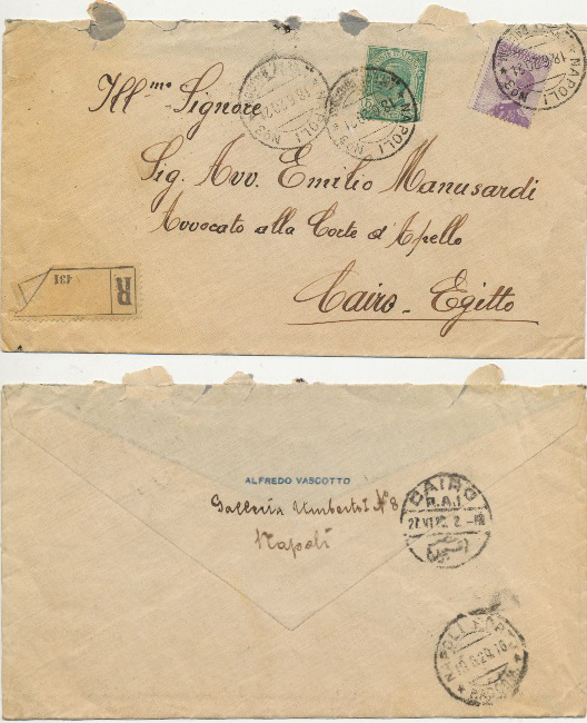 18 Jun 1920 registered cover franked one 5c Leoni definitive stamp and one 50c Michetti definitive stamp cancelled with two Napoli CDSs. Additional cancel on cover. Back shows Napoli Porto and Cairo (destination) CDS.