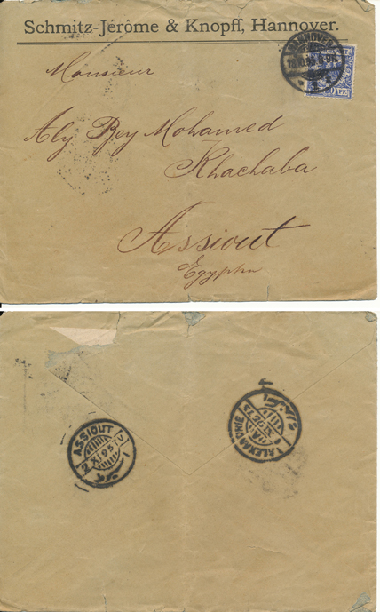 18 Oct 1895 company cover franked 1889 Reichspost 20 pfg Mi48 from Hannover to Assiout (Swiss Type IX) via Alexandrie (Swiss Type IX) Egypt.