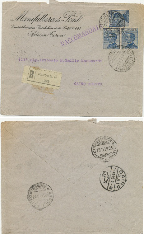 18 Nov 1919 registered cover franked 3x25c stamps tied with two Torino (Piazza Statuto) 11 bar cancellations to Cairo. Back shows Torino Ferrovia (registered) and Napolli CDS. Finally Cairo (registeration) CDS.