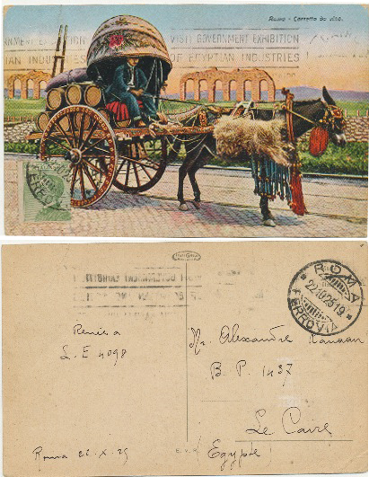 22 Oct 1925 postcard franked 20c italian offset stamp from Roma (Ferrovia) (9 bar) to Cairo, Egypt. Additional Roma cancel on back. Unclear arrival machine stamp at Cairo on front.