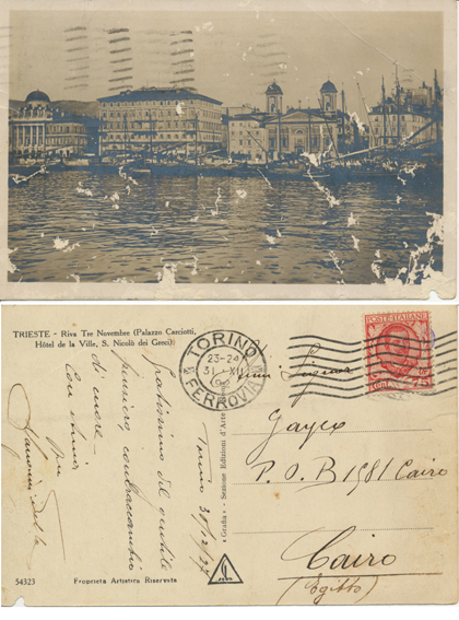 31 Dec 1927 postcard franked 75cent from Torino, Italy to Cairo.