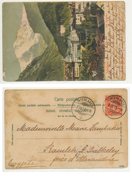 | 1SWW | 2 Aug 1903 postcard franked 10 centimes from Interlaken, Switzerland to Alexandrie, Egypte. | ||