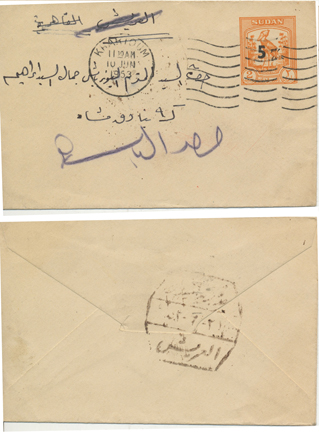 | 1SUD | 10 June 1953 cover sent from Khartoum (Sudan) to El Arish military camp in Sinai. |